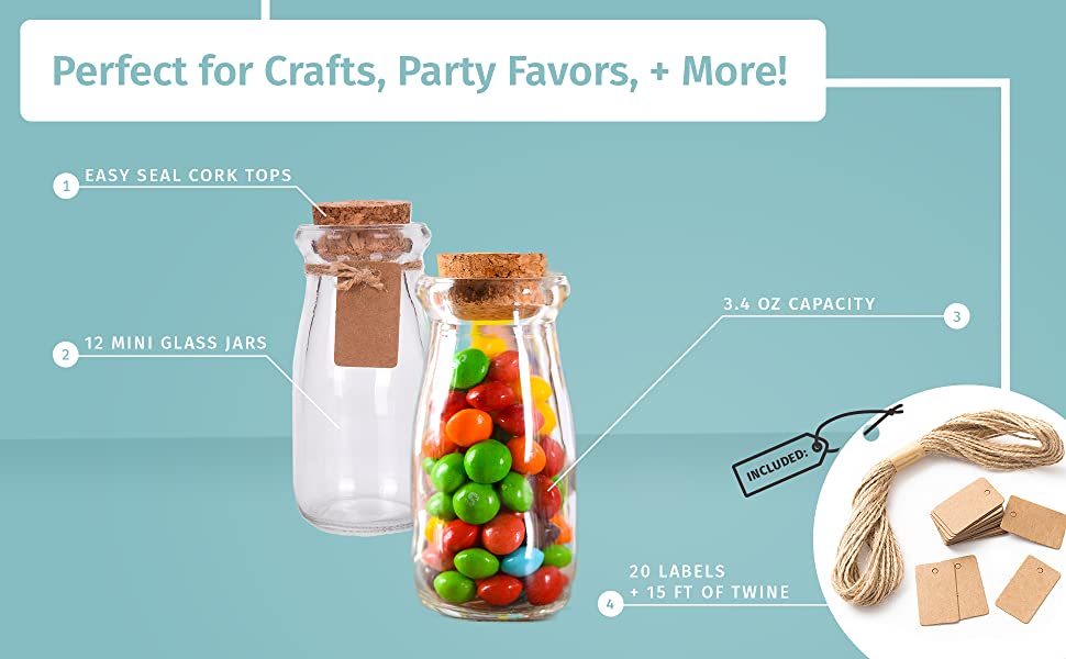 - बोनस: आमच्या कॉर्क केलेल्या मिनी जारमध्ये 20 तपकिरी कागदाची लेबले आणि स्ट्रिंगचा एक मोठा बंडल समाविष्ट आहे, जेणेकरून तुम्ही प्रत्येकाला तुमचा स्वतःचा वैयक्तिक स्पर्श जोडू शकताबाटली!