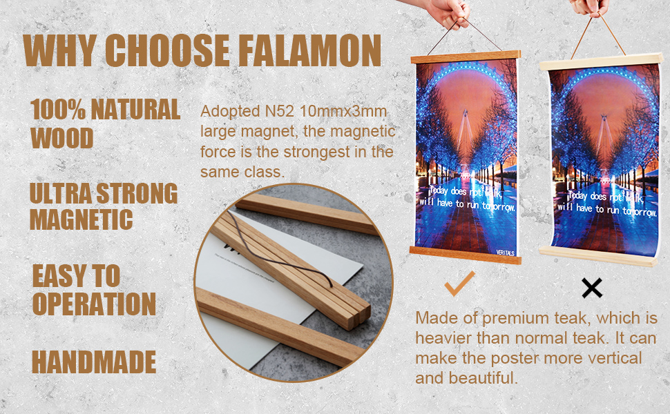 - แม่เหล็ก N52 อันทรงพลัง: ไม้แขวนโครงโปสเตอร์แม่เหล็ก FALAMON พร้อมแม่เหล็ก N52 อันทรงพลังแข็งแรงเพียงพอสำหรับแขวนโปสเตอร์ที่มีความยาวต่างกัน