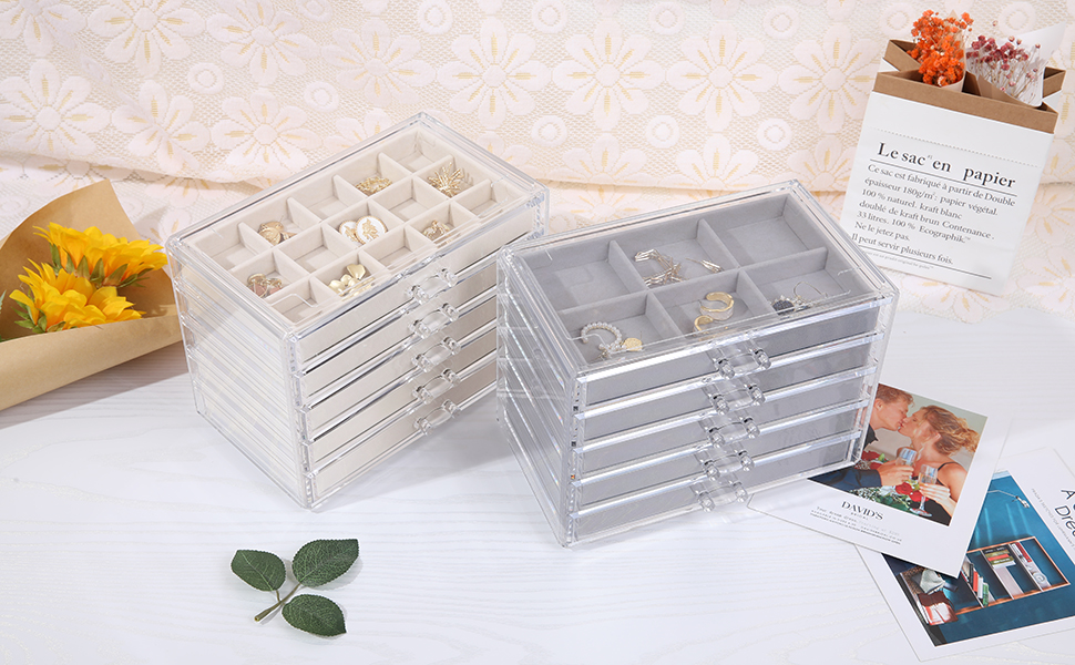 - DURABLE & LONG-LASTING – 0.17 inch tough acrylic in the outside, including shell and drawers. Soft velvet-like fabric wrapped MDF board in the internal tray. Drawers slide open smoothly and handles are easy to grip