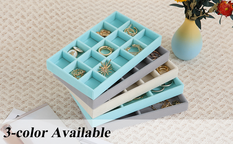 - SPACIOUS & COMPACT – This earring jewelry box has 15 small slots in each first 3 levels, 6 medium compartments in fourth drawer and 2 larger area in the last tier which great to holding small earring studs or large earring hoops