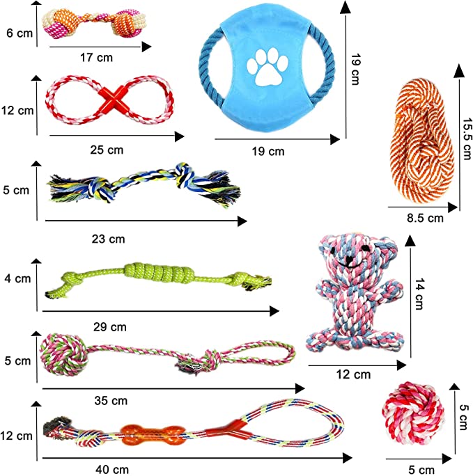 A Variety of Heavy Duty Dog Toys Come in this 10 Piece Dog Toy Bundle, Dog Toys Bulk – Dog Ropes include: Dog tug toys, Flossie dental toys for dogs, Rope dog ball toy, Dog Chew Toys for Aggressive Chewers, and these are all interactive toys for dogs that will entertain your dog for hours. There are durable dog toys for all size pups in this dog toy set