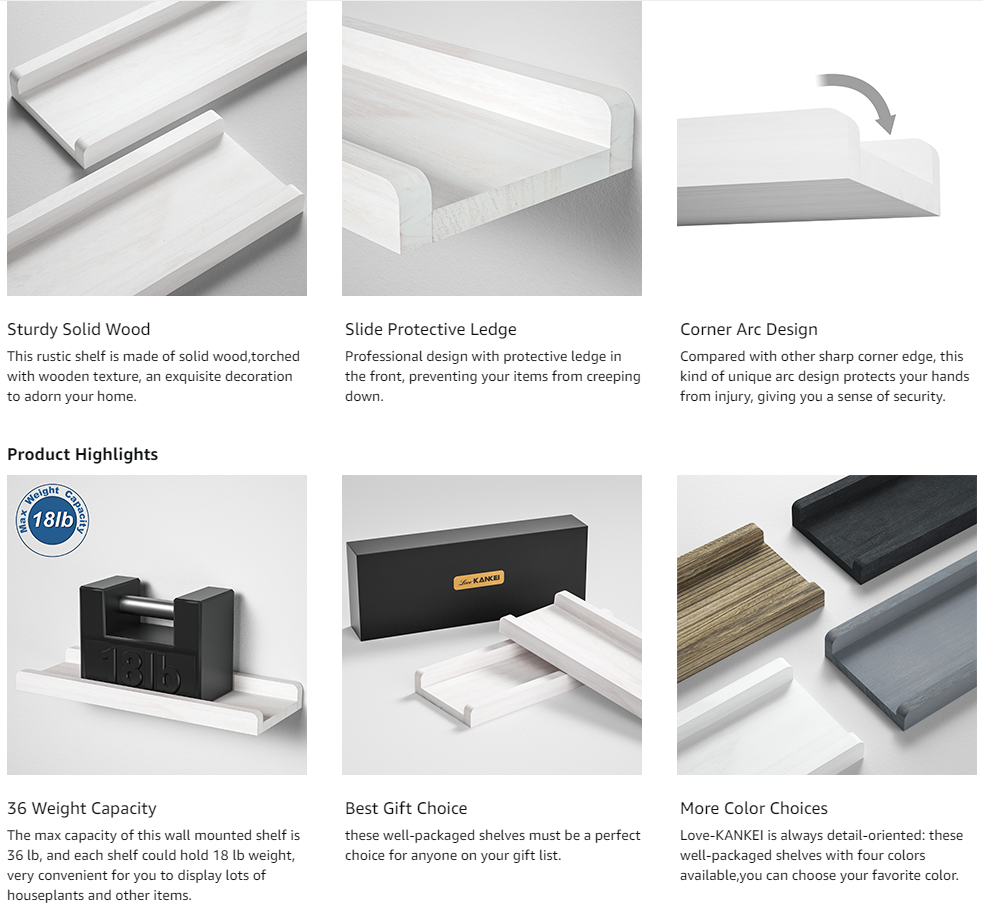 This wall shelves are made of solid wood, which is very sturdy. And it has strong weight capacity, which can support 36 lb objects, and each wood board can support 18 lb items, you can display vary items on the shelves.