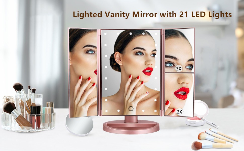 - TRI-FOLD DESIGN : Easy for take away and daily maintenance, can be opened or folded this light up mirror when not using to protect it away from the dust or scratches. Special crafted champagne ROSE GOLD color, quite elegant and sleek appearance. This is a good birthday gift for women.