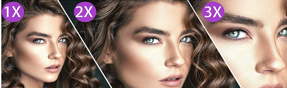 - 3X/2X/1X MAGNIFICATIONS:1X true Mirror in the middle and left side, 2X and 3X magnifying mirror on the right side, Wudeweike lighted makeup mirror can provide wide-angle viewing and create an ultra clear view of your skin to make your dress more perfect, great for applying eyeliner, mascara, grooming brows, and tweezing.